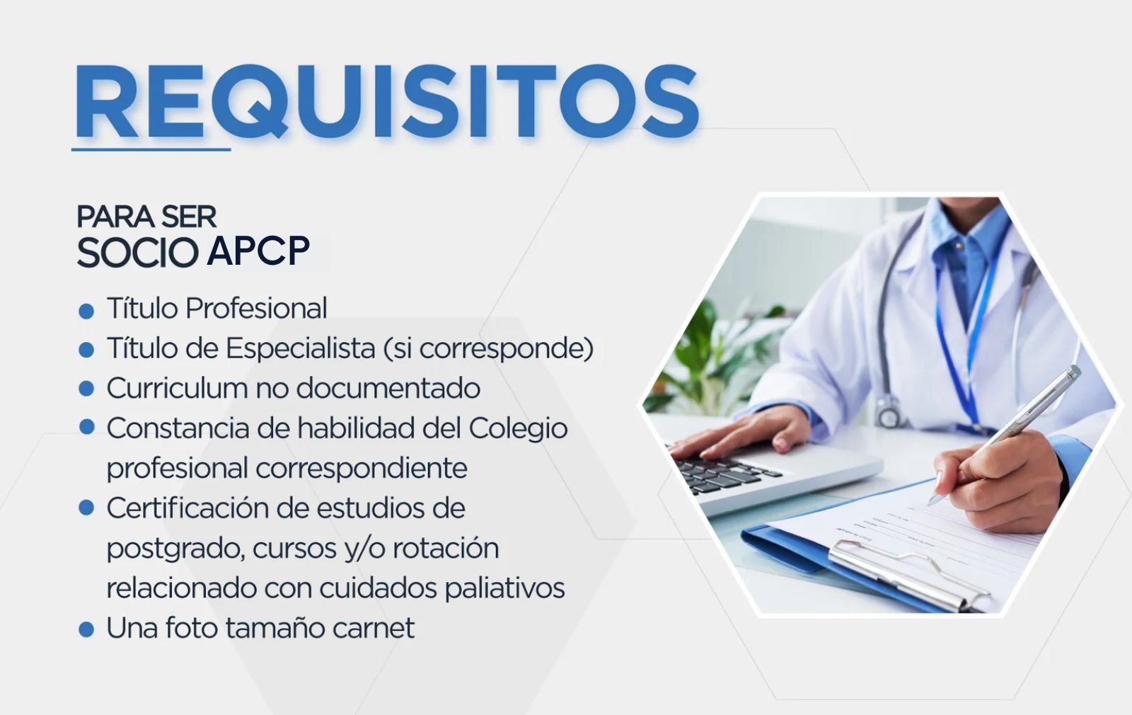 - La incorporación a la Asociación Peruana de Cuidados Paliativos es el proceso o procedimiento por el cual los profesionales del ámbito de la salud y otros (sacerdotes, voluntarias, asistentes sociales, etc.) tienen la posibilidad de pertenecer a esta sociedad.